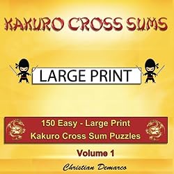 - 150 Easy - Large Print Kakuro Cross SumsVery easy to readPlenty of room to write possible solutions150 puzzles and solutions1 puzzle per pageDownloadable reference guideIdeal for beginners Kakuro puzzles are number puzzles solved in a crossword style grid. A number above the diagonal line in a black square represents the total of the numbers in the white squares to the right of it. Similarly, a number below the diagonal line is the total sum of the digits in the white squares below it. The white squares can contain any of the digits 1 to 9, however, these digits cannot be repeated more than once in any vertical column or horizontal line to make the target number. For example, if the total number in the black square is 4 and there are 2 white squares, the digits must be 1 and 3, they cannot be 2 and 2. The full Kakuro Large Print number combinations can be downloaded as a PDF file 1 puzzle per page, set out in an 8.5 x 8.5 inch book. All puzzles have unique solutions and can be solved using logical methods without guessing. Solutions included.