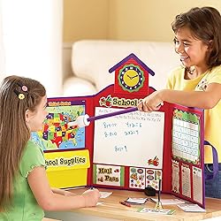 - Create positive feelings about starting school by encouraging your child to play teacher. This pop-up, tri-fold play set includes 149 supplies for teaching, learning, and having fun. Kids can present lessons, reward themselves with stickers, and write with dry-erase markers on the board.