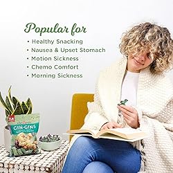 - Life is better with Gin Gins Original Ginger Chews, as they are popular for healthy snacking, nausea, chemotherapy and motion sickness. The Ginger People creates great-tasting products made from sustainably sourced ginger and turmeric that supports overall health and wellness. Enjoy these super-delicious, super-soothing products made for a healthy lifestyle. These tingly, chewy treats are an enjoyable alternative to anti-nausea medicine. Whether you’re treating a belly ache, a bout of nausea or simply indulging yourself, always have these classic, yummy ginger candies in your stash. Made with 10% fresh ginger – more than any other brand. Sweetened with cane sugar – nothing artificial. Sustainably farmed ginger – locally grown near the candy factory. Great for travel and nausea-related conditions.