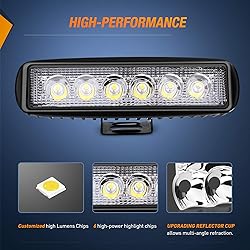 SUPER BRIGHT LIGHT: High-quality LED chips emit very bright and white light, PMMA lens with high light transmittance, clear view. FURTHER IRRADIATION DISTANCE: Concentrated spot beam illuminates to further distance, lighting up the forward dark road. BETTER HEAT DISSIPATION: Special designed die-cast aluminum alloy cooling fins effectively extend the lifespan to over 30,000 hours WATERPROOF RATE: IP67; waterproof up to 3.3 feet of water for 30 minutes and effectively dustproof. PACKAGE INCLUDE: 2PCS 18W LED Work Lights and Mounting Brackets