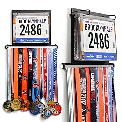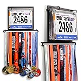 HOLDS UP TO 100 BIBS AND 24 MEDAL: Proudly showcases your running medals on the sturdy bottom hanger bar and your race bibs in protective vinyl sleeves – perfect for marathons, half-marathons, 5Ks, triathlons, and all your running achievements in one organized wall display PROTECTION FOR YOUR MEMORABILIA: Includes 12 high-quality clear vinyl protector sheets to shield your race bibs from dust, creases, and fading; each sleeve features a writable top for adding race details, photos, or notes with a permanent marker. Additional sleeves and medal extension bars can be added for an expandable gift-ready display DURABLE POWDER COATED CONSTRUCTION: Crafted from high-quality steel measuring 14" W x 10.25" H, this running medal hanger offers long-lasting strength and an attractive design that elevates any home gym, office, or living space EASY WALL INSTALLATION WITH EVERYTHING INCLUDED: Mount your medal display quickly and securely using the complete hardware kit – 5 screws, 5 drywall anchors, 5 rubber standoffs for wall protection, 2 bib hooks, and 2 extra nuts – no extra trips to the hardware store needed PERFECT GIFT FOR RUNNERS, TRIATHLETES AND MARATHONERS: Celebrate race milestones, with this thoughtful race medal hanger display from Gone For a Run, a U.S. family-owned business. Ideal for birthdays, holidays, or first marathon gifts