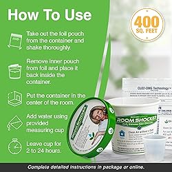 - The Room Shocker efficiently eliminates tough smells in areas up to 400 sq. feet, such as cigarette smoke and pet odors, within 4 to 24 hours. Its ClO2-DMG Technology ensures a non-toxic, child- and pet-safe formula, perfect for homes and offices. Activation is simple with cold tap water, requiring no scrubbing or harsh chemicals. Made in the USA, this biodegradable product offers a clean alternative to odor absorbers for maintaining a fresh and clean environment. Strong odors may require multiple treatments or longer exposure times
