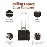 Rolling laptop case designed for on-the-go professionals Easy-access front pocket with compartments for smaller items like pens, notepads, and business cards Designed to protect laptops with up to 15.6 inch screens Lightweight yet sturdy design Fits under airplane seats Adjustable push-button locking handle with quick-rolling wheels
