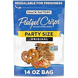 ORIGINAL PRETZEL CHIPS: Snack Factory Original Pretzel Crisps give you the best part of traditional pretzels without the doughy center THIN AND CRUNCHY: These pretzel thins are perfectly salted and baked just right for a hearty, satisfying crunch in a slim, sturdy shape DIP OR NO DIP: Our thin pretzels are flat-out delicious on their own, and they pair perfectly with dips such as salsa, hummus and cheese NON-GMO INGREDIENTS: Snack Factory Pretzel Crisps are made with quality ingredients and are Non-GMO Project Verified PARTY SIZE BAG: This 14-ounce resealable party size bag has about 14 servings and is perfect for sharing or satisfying your cravings for salty snacks
