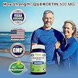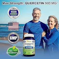 MAX STRENGTH QUERCETIN: aSquared Nutrition’s maximum strength Quercetin formula contains 500mg of Quercetin powder per capsule and 200 vegetable capsules per bottle for a full 200-day supply. Quercetin is a plant pigment flavonoid that is naturally found in berries, broccoli, and leafy greens. Quercetin is a powerful antioxidant and free radical scavenger that helps protect the body from cell membrane damage & DNA alterations. * FEEL THE DIFFERENCE: Quercetin is a powerful antioxidant. Quercetin supplementation may support immune and skin health, and cardiovascular health. Additionally, Quercetin helps fight allergies, supports circulation, supports mood & energy levels, and may help protect your kidneys, brain & liver. * POWERFUL ANTIOXIDANT: Flavonoids such as Quercetin are free radical scavengers that fight off oxidation. Diets high in Quercetin may help combat cognitive impair & allergies. * NATURAL & MADE IN THE USA: aSquared Nutrition’s Quercetin supplement contains 500mg of Quercetin Dihydrate per capsule (yielding 18% potency). Our vegan formula does NOT contain preservatives, soy, gluten, dairy or extraneous fillers. Our potent complex is made in the USA, in a GMP compliant facility. Our products undergo rigorous testing to ensure quality & purity. The flavonoid Quercetin is often taken with Berberine, Resveratrol 1000mg, CoQ10 (Coenzyme Q10), Bromelain, & Milk Thistle. * BEST VALUE ON AMAZON: Each bottle of our Quercetin 500 MG formula contains 200 vegetarian pills for a full 200-day supply. The natural flavonoid Quercetin is often taken with the polyphenol Resveratrol. Try also our Turmeric Curcumin, Berberine, 100% All-Natural Ceylon Cinnamon, Liposomal Vitamin C 1200mg, CoQ10 400mg, & Vitamin D3 K2. *