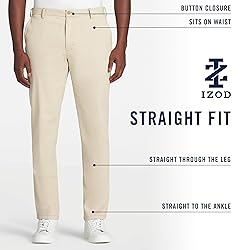 CHINO PANTS FOR MEN: Our men’s IZOD pants deliver casual comfort combined with timeless style. These straight-leg Saltwater Stretch men’s chino pants are versatile and perfect for any occasion, from the office to a day of golf to a night out. CASUAL PANTS FOR MEN: Always in style, these classy dress pants are available in multiple color and size options. Our beach-inspired men's pants feature a button closure, 4 pockets, a belt-loop waistband, and a moderate-rise waist. HIGH-QUALITY, COMFORTABLE DESIGN: These IZOD dress pants for men are made from 98% cotton and 2% spandex. They feature an easy, slim-fit through the leg and ankle and offer the right amount of stretch for all-day comfort. EASY CARE: These chinos are a wardrobe staple with a classic saltwater wash that gives them a trendy worn look. To keep these flex pants looking great, simply machine wash them on a gentle setting with mild soap and tumble dry them on low. IZOD QUALITY: IZOD makes high-quality clothing for men who want comfort but don't want to sacrifice style. Our clothing seamlessly goes from work to play while providing great looks and a great fit.