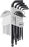 26-piece long-arm hex key set for quickly tightening or loosening fasteners; standard and metric sizes Made of chrome-vanadium steel for rugged strength; black oxide finish for protection against corrosion; sand blasted for a smooth surface Long-arm design provides extended reach and enhanced leverage and torque; beveled ends ensure easy insertion Ball-end design allows entry angle of up to 25 degrees for easily reaching around obstructions Includes 2 hinged storage cases with dedicated slots and clear size markings; backed by an Amazon Basics limited 1-year warranty