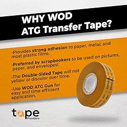 COMPATIBLE WITH ATG PINK GLIDER GUN - These rolls are designed to fit both our WOD ATG Gun Dispenser and the ATG Pink Glider Gun, ensuring a smooth and efficient application. For tips on using them with the Pink Glider Gun, check out our instructional / tips videos. ACID-FREE - WOD ATG20RW is a double-sided tape that carries a Glass Stabilized Solvent Based Acrylic Adhesive acid neutral, not soluble in water; it is preferred by Scrapbookers to be used on pictures, paper web, and for sealing envelopes with the guarantee that the tape will not yellow or discolor your photo or artwork over time. MULTI-USE – WOD ATG Tape is commonly used for scrapbooking, picture framing, photo mounting, and many other Arts & Crafts applications; also, it is widely used for strong, long-lasting bonds created with wood, glass, paper, plastics, paint, and metal foils, as well as for Greeting Cards, Invitations, Party Banners and Decorations, and Gift Wrapping. QUICK ADHESION – WOD ATG20RW Adhesive Transfer Tape provides an excellent and immediate adhesion to paper, metal, and most plastic films, its Acrylic Adhesive bonds the desired material to the application surface when dispensing with the Applicator by creating a permanent bond for your picture framing and crafting projects, keeping the process as versatile as it sounds. WOD Tape stands as a top-selling brand on Amazon, dedicated to providing only the highest quality tape products. As a USA-based small business, our commitment to excellence extends to both our products and customer service.