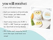 SOAP DETAILS: Hey Chickie handmade glycerin soap chicks in a jar | The perfect Easter gift for all ages. Everything you see is made from soap even down to those cute eyes and beak. Super gentle plant based ingredients, vegan friendly, and cruelty free too PACKAGING INFO: Listing includes 1 Jar with 4 carefully handcrafted chick soaps inside, each soap measuring 2.25" x 2.25" x .50" each | Packaged in Clear Jar on a nest of crinkle with white Lid | Top Label reads Hey Chickie | Jar measures 3" x 2.75" | total weight 8 oz SCENT NOTES: Honey Bunny comforting blend of apple | bergamot | orange | honey nectar PERFECT GIFT: Spread some Easter cheer and not the germs with these unique chick soaps. A perfect gift for mom, kids, sister, co-worker, friends and everyone in between. Especially adorable as Easter basket fillers or a stand alone gift to bring a smile. At Sunbasil Soap all our bath and body treats are all 100% handmade right here in USA, sourced from sustainable ingredients and made daily in small batches SOAP INGREDIENTS: glycerin, coconut oil, sustainable palm oil, castor seed oil, safflower seed oil, water, sorbitol, sorbitan oleate, soybean protein, titanium dioxide, fragrance oil