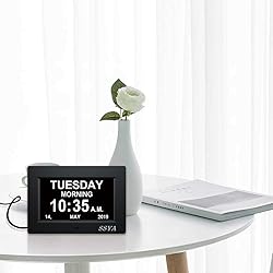 SSYA 7 Inch Calendar Clock - 12 Alarm Options, Level 5 Auto Dimmable Display,Extra Large Impaired Vision Digital Clock with Non-Abbreviated Day & Month (Black)