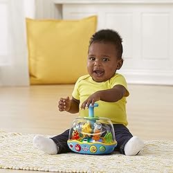 Aquarium spins, lights up and plays music when water spout is pushed Adorable ocean friends playfully swim and spin in the aquarium while the lights flash A playful phrase, a fun sound or a short tune is played each time the plunger is pressed Three colorful buttons introduce animals, colors, numbers and play music The crab, fish and starfish sing songs in playful sea animal voices