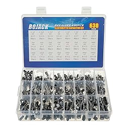 - BOJACK 24Value 630pcs Electrolytic Capacitor Assortment Box Kit High quality and long life. Nominal Capacitance : 0.1uF~1000uF Capacitance Tolerance: electrolytic +/-20% Operating Temperature Range: -40deg/C ~105+deg/C Temperature Coefficient: -55to+175deg C Package list: 0.1uF 50V 4x7 40pcs 0.22uF 50V 5x11 20pcs 0.47uF 50V 5x11 20pcs 1uF 50V 5x11 20pcs 2.2uF 50V 4x7 40pcs 3.3uF 50V 4x7 40pcs 4.7uF 50V 4x7 40pcs 10uF 25V 4x7 40pcs 10uF 50V 5x11 20pcs 22uF 16V 4x7 40pcs 22uF 25V 4x7 40pcs 33uF 16V 4x7 40pcs 47uF 10V 4x7 40pcs 47uF 25V 5x11 20pcs 47uF 50V 6x11 20pcs 100uF 16V 5x11 20pcs 100uF 25V 5x11 20pcs 220uF 10V 5x11 20pcs 220uF 25V 6x11 20pcs 330uF 25V 8x12 15pcs 470uF 10V 6x11 15pcs 470uF 16V 8x12 15pcs 680uF 16V 8x12 15pcs 1000uF 16V 10x16 10pcs