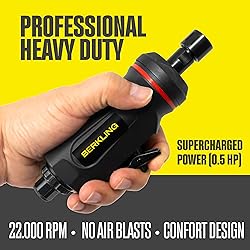 VERSATILE DESIGN: Professional-grade pneumatic die grinder with right angle, 90, 115 degree, and straight die grinder variants; Perfect for tight spaces, intricate edges, and detailed work on various materials. POWERFUL PERFORMANCE: Heavy-duty air die grinder featuring 0.5HP motor; Delivers 22,000 RPM for efficient cutting, grinding, and polishing; Compatible with standard 1/4 die grinder bits for maximum versatility. PRECISION CONTROL: Variable speed pneumatic angle grinder with smooth power delivery; Ideal for weld grinding, sanding, deburring, and detailed finishing; Provides exceptional control for professional results. ERGONOMIC COMFORT: Lightweight aluminum body mini die grinder with comfort grip; Reduces fatigue during extended use; Perfect balance between the power of an air angle grinder and precision of a pneumatic pencil grinder. WORKSHOP ESSENTIAL: A professional-grade pneumatic right angle die grinder designed to work with standard air compressors, delivering strong, smooth performance with low 84 dB noise—perfect for metal, wood, polishing, sanding, and precision work.
