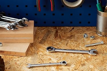 7-piece ratchet wrench set with chrome finish, manufactured from durable chrome vanadium (Cr-V) steel, drop forged and hardened treated 72-tooth ratchet gears need only a 5-degree working swing arc Full-drive box ends deliver reliable torque to tighten or loosen any bolt without rounding Includes 8mm, 10mm, 12mm, 13mm, 14mm, 15mm, and 17mm