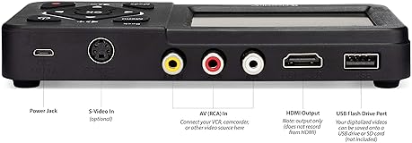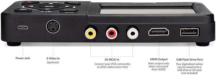 Convert Your Old Video Tapes or Camcorder Tapes to Digital Format With The Touch of a Button (Recording Resolution: SD 640x480 or 720x480 Pixels. Does Not Upscale To HD. Does Not Record From Modern HDMI Sources.) Record and Digitalize Video From VHS, VCR's, DVD Players, DVR's, Camcorders, Hi8, & Retro Gaming Systems (IMPORTANT: A WORKING VCR/CAMCORDER AND WORKING VIDEO TAPES ARE REQUIRED; CONVERTER DOES NOT PLAY VIDEO TAPES BY ITSELF) No Computer or Software Required - Just Hook It Up & Start Recording - Records Videos Directly Onto USB Flash Drive or SD Card (REQUIRED, NOT INCLUDED; 512 GB or less) What's New In The Video2Digital Version 2.0 (Second Generation): Extra-Large 3.5" Preview Screen, Better Recording Quality, Improved Audio/Video Sync Protection, Auto Stop Feature (60, 90, 120, 150 Minutes), Mobile-Friendly MP4 Recording Format, & Pause/Resume While Recording Includes 1-Year Warranty & Tech Support from ClearClick, a USA Small Business