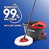 REMOVES OVER 99% OF BACTERIA W/ JUST WATER: O-Cedar's EasyWring Microfiber Spin Mop & Bucket Floor Cleaning System provides a deep-cleaning solution for all your at home needs by effectively removing dirt, grime and over 99% of bacteria with just water! It is safe on all hard floor surfaces, including finished hardwood, wood, laminate, tile, vinyl, and more. HANDS-FREE WRINGING: Our exclusive mop bucket design features a built-in wringer that allows for hands-free wringing while Splash Guard keeps water splash and spray inside the bucket when wringing or when transporting the bucket from room to room. WASHABLE & REUSABLE MOP REFILLS: The EasyWring Microfiber Mop Head can be machine washed and reused! Keep an extra refill handy for the next mess. Compatible with the Easy Wring Mop Refill DEEP CLEANING MICROFIBER: O-Cedar's EasyWring Microfiber Spin Mop & Bucket Floor Cleaning System uses millions of strands of advanced microfiber to effectively capture dirt and grime with just plain water, eliminating the need for harsh chemicals. Safe for all hard flooring, including finished hardwood, wood, laminate, tile, vinyl and more. REACHES IN CORNERS: Due to the patented triangle mop-head and ability to rotate 360 degrees, the EasyWring Mop can reach and clean deep into corners, under furniture, alongside baseboards, and between tile. NEW REFILL, CLEAN START: Be prepared for daily messes with extra mop refills. Assign each room in your home its own refill and avoid spreading dirt from one area to another. Stock up ahead of time so you’re always ready for the next mess. Easy hands-free wringing with foot pedal & bucket wringer