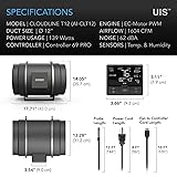 - Designed to ventilate hydroponic grow rooms, transfer heating/cooling, cool AV closets, and exhaust odors. Dynamic temperature and humidity programming, with timers, grow cycles, scheduling, minimum speed. Connect with our app via Bluetooth to access advance programs, alarms, notifications, and view climate data. Mixed flow design combined with a PWM-controlled EC-motor for a truly quiet and energy efficient performance. Duct Size: 12” | Dimensions: 12.2 x 17.7 x 14.0 in. | Airflow: 1604 CFM | Noise: 62 dBA | Bearings: Dual Ball Product Description A smart inline duct fan designed to quietly ventilate hydroponic grow rooms, boost heating/cooling to rooms, circulate fresh air, exhaust projects, and cool AV closets. Featuring an inline mixed-flow design, the duct fan can maintain airflow even in high static pressure applications. Contains an EC-motor with PWM-control for quiet and energy-efficient performance. The motor box containing the fan’s impeller and blades can be detached from the mounted frame for easy cleaning and maintenance. Includes a smart controller with dynamic climate and time-based programming, and can connect to one additional fan. Complete kit includes one duct fan unit, one thermal controller, one corded thermal probe, two duct clamps, installation manual, and all necessary mounting hardware. Smart Controller Features smart programming that not only has basic temperature and humidity triggers, but also allows you to set dynamic fan speeds that would respond based on their changes. Go even further by setting a minimum speed that the fan will run at constantly and would only increase when triggered. Timer, cycle, and schedule modes add custom on-demand activation for a variety of uses. Securely connect with the AC Infinity App via Bluetooth to access your fan remotely, unlock advance programs, set notifications, view historical climate charts, and export CSV data. This controller can connect to two AC Infinity fans with EC Motors including other CLOUDLINE fan sizes, and CLOUDRAY clip-on circulation fans. Quiet and Energy Efficient Design Unlike common duct fans that uses an AC-motor which are loud and unmanageable, this duct fan features an EC-motor that is controlled using PWM (Pulse Width Modulation). This technology enables motors to be able to run smoothly at extremely low RPM speeds without generating additional heat or noise. In addition, the duct fan uses a mixed flow design using a stator blade and dual hydrodynamic wind circles. This gives it a high static pressure rating, enabling it to deliver airflow even in applications where air movement is being restricted. The motor houses dual ball bearings rated at 67,000 hours which allows the duct fan unit to be mounted in any direction. The unit is IP44 rated to be highly resistant to dust and liquids, and performs well even in harsh environments. Applications This quiet duct fan system is popular in a variety of applications including cooling AV equipment rooms, closets, racks, and cabinets. Due to its low noise and advanced control features, it’s also used in various air circulation and ventilation projects including hydroponic grow rooms and tents, exhausting bathrooms and attics, and other installations. Product Identification Manufacturer AC Infinity Inc. Product Name CLOUDLINE T12 Product Model AI-CLT12 UPC Code 819137021013 Product and Mounting Dimensions - Fan Unit Duct Size 12" Total Dimensions 12.28 x 17.71 x 14.05 in. (31.2 x 45.0 x 35.7 cm) Mounting Hole-To-Hole Distance 7.00 x 7.12 in. (17.8 x 18.1 cm) Screw Hole Size Ø 0.462 in. (Ø 1.18 cm) Cord Length to Controller 240 in. (20 feet) Cord Length to Plug 96 in. (8 feet) Product and Mounting Dimensions - Controller Total Dimensions 5.19 x 2.91 x 1.06 in. (13.2 x 7.4 x 2.7 cm) Hole to Hole Distance 4.71 x 2.64 in. (12.0 x 6.7 cm) Screw Hole Size Ø 0.119 in (Ø 0.3 cm) Display Size 3.5 x 1.4 in. (9 x 3.5 cm) Sensor Probe Length 144 in. (12 feet) Product Performance and Technical Specs Total Airflow 1604 CFM Total Noise 62 dBA Static Pressure 818 Pa Voltage 100-240V AC Frequency 50/60Hz Max Power Draw 250 W Average Power Usage 139 W Current 2.5 A Power Connector Type US Plug (NEMA 1-15 Type-A) Operating Humidity 35 to 85% RH Operating Temperature 32 to 140°F Ingress Protection IP 44 Fan Bearings Dual Ball Mounting Positions Horizontal or Vertical L10 Life Expectancy 67,000 Hours CE Certification (Whole Product) PDF ETL Cert. (Whole Product) PDF RoHS Cert. (Whole Product) PDF SAA Cert. (Whole Product) PDF FCC Cert. (Whole Product) PDF Product Manual Product Manual PDF
