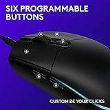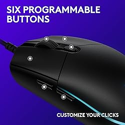 Step up to gaming grade with 8,000 DPI optical sensor with zero filtering and smoothing for improved control and precision over standard computer mice with G203 wired mouse Customize G203 RGB gaming mouse lighting via Logitech G HUB with colors, presets, or your own designs; sync with other LIGHTSYNC gear, react to screen color shifts, or flash to the beat for an immersive experience The six-button mouse design offers comfort and control; with Logitech G HUB, assign commands, controls, or key binds to customize and simplify your gameplay experience With Logitech G HUB software, customize sensitivity settings on this PC gaming mouse to suit your playstyle and quickly cycle between up to 5 DPI settings using the middle DPI cycle button Mechanical primary buttons are tensioned with durable metal springs for reliable performance and feel, with crisp clicks and precise feedback Connect using USB Type-A; Cable length: 6.89 ft (2.1 m)