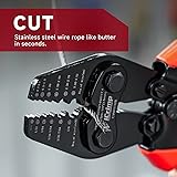 13 INCH TOOL with 6 cavities fordiameter 1/32”-1/8”(0.3mm-3.5mm) wire rope and applicable to aluminum oval sleeves,doublebarrel ferrulesfor railing,decking,picture hanging. ◆SOLID◆ Constructed of high quality Cr-MO steel with superior rust resistance and the connection joints are processed with Metal Sheet Processing to improve tool’s ruggedness and force transmission.The cutting blade with high hardness and good abrasion resistance can bring excellent experience. ◆PRECISE◆ Two pieces jaw is processed with WIRE EDM CUTTING to ensure the jaw’s accuracy and bring phenomenonaltolerance when two pieces jaws be together. ◆MULTIFUNCTIONAL◆ With built-in cutting blade,this tool can also cut the wire rope upto 3.5mm in seconds effortlessly,saves money from buying a single cutter. ◆HUMANIZED◆ With ratcheting mechanism,it’s more efficient to crimp the sleeves and convenient to hold the sleeves.Ergonomic sure-grip bring comfortable experience during operation.