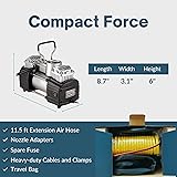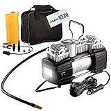 RAPID INFLATION: Our 12V double cylinder tire pump inflates in under 2 mins, 4X faster than standard compressors. Maxing at 150 Psi, it's perfect for trucks, cars, and SUVs. Compact for travel, it ensures quick, efficient tire inflation every time. COMPLETE TIRE CARE KIT: Our 12V air compressor, tailored for truck tires, includes an 11.5ft extension hose, various nozzles, spare fuse, robust cables with clamps, and a travel-friendly bag. Compact at 8.7” x 7.1” x 3.1” for hassle-free portability. ILLUMINATE & INFLATE: Enhance your tire care with Asani's 12V tire air compressor. Bright LED light ensures visibility in low light. Trust the dial pressure gauge for accurate inflation. Your go-to for precise tire care, day or night. VERSATILE PERFORMANCE: Asani's tire inflator with gauge effortlessly suits SUVs, trucks, RVs, bicycles, and more. Multiple adapters ensure a perfect fit. Connect to your car battery or cigarette lighter for easy power-up. DURABLE CONSTRUCTION: Crafted with robust metal for exceptional durability, Asani's electric air pump boasts a rust-resistant pure copper connector and noise-reducing rubber feet. Choose enduring quality for your tire care needs.