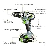 2.0 Ah Fast Charging Battery: The kit comes with a 20-Volt 2000 mAh large capacity Li-ion battery, so you never need to worry about running out of power in the middle of a project. 2.4 A fast charger can charge one battery in as little as 1 hour 18+2 Torque Adjustment: This 20 V Drill Driver can provide powerful torque and also allows you to choose between two-speed settings (0 – 360 RPM or 0 – 1,300 RPM), so you will always have the power you need. The clutch has a total of 18 different torque settings and 2 modes (driving, drilling), to avoid incidents where you apply too much power and then wind up stripping the screw 3/8 inch Keyless Chuck & Variable Trigger: A 3/8 inch keyless ratcheting chuck can hold most bits and also makes them ideal for general-purpose drilling. Variable speed trigger allows you to select different speeds depending on the task at hand Ergonomic Handle and LED light: The anti-slip grip ergonomic handle is made of soft rubber, which fits nicely in your hand. Comes with a trigger-delay LED work light that stays on for ten seconds after you’ve let go of the trigger, useful in dark basements or underneath a vehicle. What you get: 1*20 V Cordless Drill Driver, 1*20 V Li-ion Batteries, 1* 2.4 A Quick Charger, 10*2” Screwdriver bits, 6* twist drill bits What you get: 1 * 20 V Cordless Drill Driver, 1 * 20 V Li-ion Batteries, 1 * 2.4 A Quick Charger, 10 * 2-inch Screwdriver bits, 6 * twist drill bits