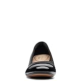 Synthetic black leather-look upper with patent toe cap Ultimate Comfort foam footbed for all-day comfort and support Easy-walk block heel Durable rubber outsole