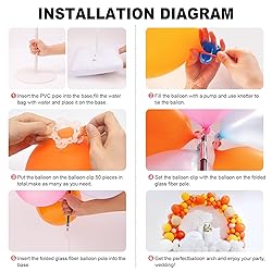 【COMPLETE PARTY PACKAGE】: Balloons arch kit package includes 15 folded glass fiber pole, 2 PVC Base, 2 PVC pipe, 2 water(sand) fillable bag, 1 manual pump, 50 balloon clips, 2 balloon knotter, 2 ground secure ropes, 4 ground nails. It will enough for all party decoration you need. 【HIGH QUALITY & STURDY】: Well-designed mesh base and water bag, stable PVC pipe.It will not shake sharply due to wind or object collision.The balloon pole is a folded integral accessory, with the single length is 17 inches high strength black glass fiber pole, bending is not easy to break,You can reuse it anywhere you want. 【ADJUSTABLE SIZE&EASY ASSEMBLY】: The height and width of the arch can be adjusted at will by adjusting the distance between the bases. Install this balloon arch will no more than 2 minutes. 【WIDE APPLICATIONS】: The bolloon arch kit is suitable for birthday party, family parties, Christmas and Halloween but also for catered presentations, wedding and baby showers and so on.Use your creativity to decorate your party with different balloons. 【FRIENDLY CUSTOMER SERVIES】: We created with extra care and attention-to-detail to provide the best experience for you.