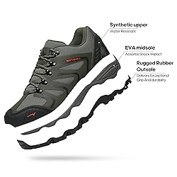 Roomy Fit: These men's hiking shoes are designed with a roomy toe box that accommodates wide feet for all-day wear during outdoor adventures. Waterproof Build: These men's trekking shoes feature waterproof membrane construction, keeping feet dry and comfortable in shallow streams and puddles. All-Round Protection: These men's outdoor shoes boast a robust rubber toe cap and reinforced heel for impact protection and stability on rugged trails. All-Terrain Grip: These men's hiking shoes feature a rugged rubber outsole with deep lugs for reliable grip on various surfaces. Trail Support: The flexible MD midsole in these men's hiking shoes reduces foot fatigue and absorbs shock for comfortable support outdoors. Outdoor Performance: These men's hiking shoes are designed for hiking, camping, and working outside, providing reliable performance and comfort.