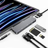 Compatible with iPad Pro 13inch/11inch/12.9inch M4 M2 M1, iPad Air 5, iPad Air 4, iPad mini 6. Turn your iPad Pro's single USB-C port into a huge 7 ports. With HDMI port, 3.5mm Audio jack, USB 3.0 port, an SD/microSD card reader, a USB-C Data port, a USB-C PD port, you have everything you'll ever need. Vivid Display: Mirror or extend your screen with 4K HDMI output and directly stream 4K@30Hz UHD or 2K@60Hz, 1080P@60Hz video to HDTV,monitors,or projectors.Enable you share stunning movies/games on a bigger screen! 3.5mm Audio Jack: Connect earphone,headphone or speaker.Support Microphone input.Built-in DAC audio chip processes digital signal into Hi-Res sound, up to 384khz-32bit audio output. Files Transfer: USB 3.0 port, you can connect USB flash drive,hard drive,keyboard,mouse and more USB devices and transfer data at super speeds of 5Gbps. Convenient access to files from SD/Micro SD Card. USB-C PD port & USB-C Data port : USB C Power Delivery input port to provide high-speed pass-through 100W charging to your iPad. USB-C Data port for transfer data via Type-C cable or flash drive.