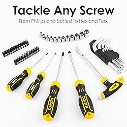 HIGH QUALITY & STANDARDS: Forged from high-quality steel and finished in high-polish chrome, durable, anti-corrosive. Handles are made of TPR material, comfortable for grip, anti-fatigue. All the tools meet or exceed ANSI critical standards. COMPLETE VARIETIES: a combination of a variety of basic tools, screwdrivers, hammer, adjustable wrench, hex key sets, measuring tape, pliers, sockets set, bits set and so on. Limited tools with unlimited functionality. MULTIFUNCTION: This household tool kit contains tools for small repairs and basic DIY projects like picture hanging, furniture assembling, lighting, screw tightening, woodwork, plumbing repair, around the house, office, garage, workshop,body shops. WIDELY USED- It is perfect for homeowners, handymen, construction workers, mechanics. Tool set for men women college students kids, great gift idea. EASY TO CARRY & STORAGE:This tool kit comes with a sturdy blow-molded case for easy storage and portability. Sturdy interior and organizers of this tool box keep tools in place. Put the side with ''DOWELL'' up when opening the toolbox to prevent the tools falling out from the box.