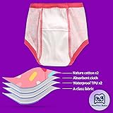 Soft Muslin Cotton: The newly updated training pants are made of natural and safe cotton. Outer layer is 100% cotton. Inner layers are cotton+muslin+TPU, increasing maximum softness and the absorption of urine. The soft touch and natural warmth feeling can make baby move freely and enjoy potty training Strong Urine Absorption: This training underwear with thick layers have strong urine absorption which will help to avoid leakage and give enough time for parents to change the training pants for their baby. It is recommended to wash in water before wearing to maximize its effectiveness and prefect to use with our diaper pants overnight Leakproof Six Layer Structure: The baby training underpants are six layer structure , so they can absorb more moisture. If your baby takes a nap or sucks a small amount of urine, it won't leak. You don't have to worry about the mattress or bedding. Extra padding in the front and back makes them more absorbent than normal underwear Covered Elastic: Comfy stretch waistband and leg hole for greater fit and ease of pulling up and down. Washable and reusable design save you tons of money from disposable diapers Size for Potty Training Pants: 2T (waist 13.4 in, height 33.5 in, weight 24.3-26.5 lbs); 3T (waist 14.2 in, height 37.4 in, weight 26.5-32 lbs); 4T (waist 15 in, height 42 in, weight 32-36 lbs); 5T (waist 15.8 inches,height 46 in, weight 36-40 lbs); 6T (waist 16.6 inches,height 50 in, weight40-44 lbs); 7 Years=7T (waist 17.4 inches,height 54 in, weight44-48 lbs); 8 Years=8T (waist 18.2 inches,height 58 in, weight48-52 lbs)