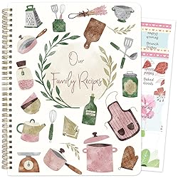 What You Get - 8.5" x 11" Recipe notebook(our family recipes cover) includes 120 pages (60 sheets), 1 sheet of 12 tabs to help with organization, appetizers, soups, brunch dishes,main dishes, side dishes, baked goods, desserts, holiday dishes, drinks, salads Make Cooking Fun - Create a cooking list and get a sense of accomplishment! More free time, try new recipes. This recipe notebook allows you to make popular recipes or create your own. Cute Design and Good Quality: Recipe Notebook Cover is cute watercolour design of cooking utensils, colourful recipe pages with cute pink polka dot printed. Gold color wire-o spiral. Paper is a nice weight so ink doesn’t bleed through as easily. Convenient Size and More Pages - 8.5" x 11" Blank Cookbook includes 120 pages (60 sheets). There is plenty of room so that you don’t have to scrunch everything up on an index card. 2 pages(1 sheet)Index , a card bag to put recipe cards in. More Than a Recipe, More Than a Gift - Our Recipes notebook are great for storing favorite recipes. As a great Thanksgiving and Christmas gift from mother to daughter, to give to new couple,as a Valentine's Day or anniversary gift, to cooking lover, as a bridal show gift