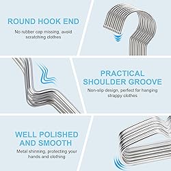 STAINLESS STEEL HANGERS: Unlike plastic hangers, wooden hangers or velvet hangers, our metal wire hangers made of stainless steel with features of waterproof, no rust, no deformation, and no fading, are a good choice for hanging your clothes in bathroom, bedroom, closet, wardrobe, cloakroom, laundry room, etc. SPACE SAVING HANGERS: The ultra slim heavy duty hangers with a thickness gauge of 0.12 inches allow you to make full use of the limited space of your wardrobe. Compared with other ordinary clothes hangers, these ultra-thin hangers takes up nearly 50% less space. NON SLIP GROOVES: The special shoulder groove design prevents clothing from falling, great for hanging garment including camisoles, tanks, underwear, shirts, T-shirts, blouses, pants, trousers, skirts, dresses, etc. Great shirt hangers and blazer hangers for men, lingerie hangers and dress hangers for women. SMOOTH EDGE: The hook ends of our coat hangers are well finished into smooth balls, NO worry about missing a rubber cap or scratching your clothes. HEAVY DUTY HANGERS: These strong load-bearing metal hangers are more sturdy and long-lasting, and will not rot due to moisture or break easily due to heavy clothes. Every family deserves these durable clothes hangers!