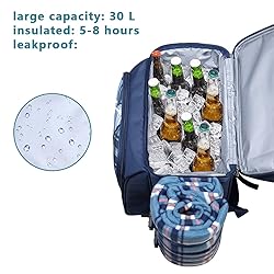 LARGE 25 CAN INSULATED COOLER COMPARTMENTS: This backpack picnic basket owns 3 COOLER compartments - Biggest central compartment size holds around 10L/25 Cans - 1.5 times capacity of others, it is leak proof backpack cooler storing drinks with ice pack. Top pocket size hold around 3.5L, not 100% leakproof but insulated, better for storing dry foods . Side wine holder is good for a large bottle. This is an impressed large picnic bag good for any party or concert. ERGONOMICS & COMFORTABLE PICNIC BACKPACK SERVICE 2 : For any large size picnic backpack for 2, wearing on back should be comfortable. Try this one! Ergonomic design make you feel it easy when you carry heavy load with picnic set for long trip,hiking,and camping . Absolutely proudly to be wedding presents baskets for young couples! SUPERIOR QUALITY PICNIC BASKET : Made of strong polyester fabric with back waterproof PU coating, non-fraying stitching, heavy duty zippers,this nice backpack picnic basket will last for years. The wine glass, plate, and chopping board made of plastic are lightweight,strong, and not easy to break comparing with glass or porcelain,especially good for outdoor use. PREMIUM PICNIC SET SUPPLIES FOR 2: Cutlery set includes 2×(stainless steel knives, forks, spoons, dinner plates, cotton napkins, wine glasses ) & 1×cheesetter knife & 1×bottle opener & 2×Salt/pepper shakers & 1×plastic chopping board, + Water resistant fleece blanket. THE PERFECT WEDDING GIFT - Out of the ordinary gift ,no matter the occasion; the perfect gifts for couples who have everything, Valentines Day Gift, bridal shower gifts for bride, wedding gifts for couples, engagement gifts for her, Christmas gifts for couples, wedding shower gifts and anniversary.