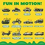 SUPER VALUE. 12 mini military army truck toy set in different designs and functions in one carrier truck. Including 12 featuring plastic soldiers figure, helicopters, tank, armored car, long truck, hovercraft, pickup truck, and so on. IDEAL For Kids Playing Construction Truck Games. Perfect size for toddlers. Great hand-eye coordination and early preschool education development. Perfect as birthday party favors, cake toppers, car seat toys. REALISTIC SOUND AND LIGHT. Our trucks have realistic sound and lighting effects, the buttons on the roof can switch out uniquely designed pleasant music. Some parts of every small truck functions like a real vehicle. SO MUCH FUN. Each Military Army Truck Is In Unique Design And Perfectly Fit In Kids' Hands And Pockets. With Only Some Sand Or Grass, Your Children Can Create Their Own Military Battle Base. SAFE & DURABLE FOR KIDS: Rest assured, our toy set meets US toy standards and is made from toxin-free materials. The mini battle cars feature a die-cast headstock and high-quality ABS plastic, ensuring durability and safety for young children. The perfect gift for any little builder!