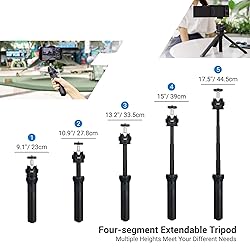 Used as a Selfie Stick & a Mini Tripod: It is made to easily convert between a selfie stick and a mini tripod with three built-in foldable legs Adjustable Height and Angle: It is designed with three adjustable height levels. You can extend the height from 9.05 inches to 17.5 inches when using as a selfie stick and extend the height from 6.69 inches to 15.15 inches when using as a mini tripod. The tripod head ball-joint allows for 360-degree rotation and up to a 90-degree tilt Stable and Durable: Weighing-in at 0.45 lb. with a foldable height of 9.05 inches and supports device up to 3.3 lb (1.5 Kg), it is easy to carry when traveling, hiking or camping. It is made of highly-durable ABS and designed with soft rubber on the feet to keep it from damaging any surface or from slipping and improve stability Wide Compatibility: It has a standard 1/4’’-20 mounting male screw on the top. This fits for an Entry-level DSLR camera, mirrorless camera, point and shoot camera, compact camcorder, Zoom recorder, selfie stick, mini projector and other devices with standard 1/4"-20 female thread. It can also be applied to a phone through the included phone clamp, fits mainstream smartphones from 2.2 to 3.7 inches wide Cold Shoe Extension: Comes with a cold shoe mount and two 1/4''-20 screw holes on the side of ball head, multiple pieces of equipment can be used at the same time such as: microphone, LED light, cold shoe adapter, magic arm and more. Suitable for vlogging, selfie, video recording, live stream