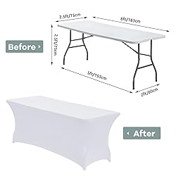 [Fabric]:Our table cover is made of 90% polyester and 10% spandex, wrinkle resistant, elastic stretchable, stain resistant and durable [Dimensions]:The 6 foot tablecloth fits tables that are 72" Length X 30" Width X 30" Height; It is always fitted and tight for Standard Folding Tables-Universal Rectangular Fitted Tablecloth Protector [Various Occasions]:We offer multiple colors for you to choose; Our table cloths may be your good choice for events like wedding, anniversary, birthday party, BBQ;Our table cover can also be used in hotel receptions, vendor, craft fair displays, buffet, the dessert, display, buffet, DJ, etc;You can choose the most suitable tablecloth according to your own needs [Easy To Set Up]: Our table cover is easy for you to set up,just wrap around your table, put 4 table legs into Elastic leg pockets,and ensuring that every part of the rectangular table is covered and spandex table cloth cover is displayed uniformly;It can be used for both indoors and outdoors [Easy To Care And Reusable]:Machine washable with cold water, mild laundey detergents are advised; Please do not bleach; Air dry only