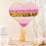 Birthday Pinata for Girls: The bright and vibrant colors of this heart shaped mini pinata create a fun and festive mood, adding an element of joy and happiness to the celebration Easy To Fill: Our pull string pinata measures 16 x 13 x 3 inches; simply cut the instructional label at the top to easily fill with assorted candy, confetti, and favors for kids (fillers not included) Take Your Party To New Heights: The interior of the Valentines pinata is made of corrugated paper, and colorful pink and gold ombre tissue paper; its sturdy construction ensures it can withstand the excitement of any party Raise The Fun Factor: Display the heart pinata on the dessert or dining tables to instantly elevate a children’s birthday party, bridal shower, wedding, bachelorette party, Valentine’s party, or even at a baby shower or hang it from the trees, railing, or ceiling Celebrate In Style: You will receive 1 heart shaped Valentines Day pinata that you can use as a wedding pinata, at your baby shower, or bridal shower party