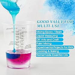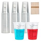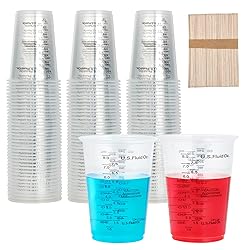 Great Value : 100 pack 10 oz (8 oz measurements) plastic measuring cups with 100 extra sturdy mixing sticks. Disposable, no cleaning for saving times, 100 disposable measuring cups available to cover many needs without running out of quantity Multi-use : Graduated clear measuring cups are perfect for mixing paints, pigments, epoxies, alcohol inks, etc. Mixing cups with stirring sticks can be used in DIY creations, painting projects and scientific experiments High Quality : These epoxy measuring cups made of premium plastic, thick and sturdy, durable and crack-resistant. Rolled rim are designed for rigidity and strength, can hold up to strenuous mixing and easily control the pouring volume and achieve accuracy Accurate: All clear plastic measuring cups featured with OZ & ML & CC measurement markings and are very accurate. With a smooth interior and clear graduations, you can stir any mixture of liquid or powder you want by 100 wooden mixing sticks Multi-use : 10 oz plastic measuring cups with extra sturdy mixing sticks also can easily used to measure out precise quantities of spices or other ingredients for cooking, baking, mixing sauces, homemade essential oils and perfumes