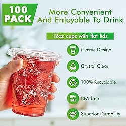 - LILYMICKY 100 SETS 12 OZ CLEAR PLASTIC CUPS WITH FLAT LIDS: ✓We are committed to providing wide variety of disposable plastic products to facilitate your life and making you enjoy yourself. BEST CHOOSE FOR DRINKS: 1.Made of high quality flexible plastic, upgraded and thickened, designed with rolled edges for a smooth finish. 2.Durable and steady, cups with lids are leak tightness,perfect for on the go use.Impact resistant and crack resistant. Better quality and more reliable than others. 3.Crystal clear appearance can shows beautiful colors and the crystal bubbles of various drinks, such as coffee, smoothies, shakes, juice, bubble boba, lemonade, sodas yogurt, parfait and more. PACKAGE INCLUDE: 100 × 12 oz clear plastic cup 100 × flat lids with hole CAUTIONS : ☆ The PET plastic cups are only suitable for cold or room temperature drinks and food. ☆ Do not put hot coffee or other hot drinks in these 12 oz cold drinks cups or put them in the microwave or dishwasher.