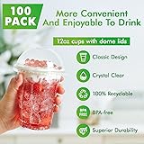 Sets of 100 : The package contains 12 oz clear plastic cups with matching lids. You can easily hold these iced coffee cups in your hand or a car cup holder—an economical way to make your cold drinks and still keep them convenient and enjoyable Leak-Free cups with lids : The rolled rim design allows the lid to fit tightly with the 12 oz plastic cups to prevent leaks or drips, providing a comfortable drinking experience. Very suitable for daily use or serving guests' drinks on the go Excellent Quality : 12 oz plastic cups with dome lids, excellent quality with crystal clear look. All made of upgraded thickened PET material, smooth and durable. Ultra transparency presents the delicious appearance of beverages perfectly Multi-use : These disposable drinking cups with lids would be the best choice for iced coffee, lattes, lemonade, smoothies, milkshakes, bubble boba, and Slurpee, also for pudding. Simple packaging changes making difference and better pleasure After Sales Service : Each package includes 100 plastic cups and 100 dome lids. All clear plastic cups with dome lids are made of PET material can only hold drinks at room temperature or any cold beverage(under 113 ℉)