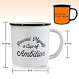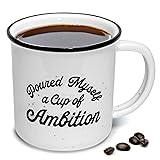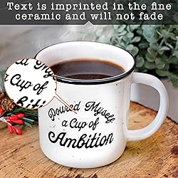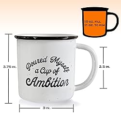 Express your humor to your friends and loved ones with our Pour Myself a Cup of Ambition mug; Spend quality time with them as you sip your favorite beverage using our coffee mug cup ambition The perfect gift for any occasion, our cup ambition coffee mug makes special events and coffee sessions at home or in the office a lot more enjoyable Imprinted text does not fade on our ceramic mug; Our cup of ambition mug with funny saying will help you get through the week Our microwave-safe, dishwasher-safe ambition coffee mug is made of high-quality ceramic that does not easily break Our cup ambition mug designed in the USA and made with the highest quality and safest materials is an ideal campfire mug for hot and cold drinks