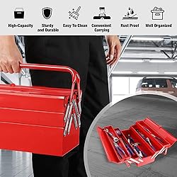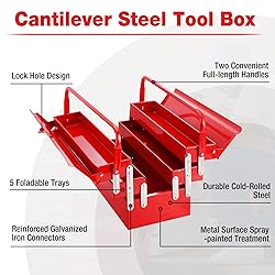 5-TRAY DESIGN - Retractable 5-tray design makes it convenient for putting different tools on each tray and easier to access tools while using.And the portable tool box measures 18"(465mm) L x 7.87"(200mm) W x 7.76" H(197mm). STURDY & DURABLE - Made of high quality carbon steel is of great hardness and durability,the folding rod fixed with rivet provides higher loading capacity. SAFE & CONVENIENT - Eqiupped with a pair of smooth handle and lock hole design,which makes it easy for carrying and more secure. EASY TO CLEAN - Metal surface spray-painted treatment makes it easy to clean and preventing rust.The curling design is good for hand protection. WIDELY APPLICATION - Providing a more efficient way to keep your often-used tools organized and can be widely used in workshops, garages, repair shops.