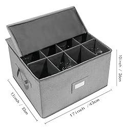 Polyester PREMIUM GLASS STORAGE BOX -Wine Glass Storage Box with Dividers Holds up to 12 wine glasses, Dimensions are 17''L x 13'' W x 10''H, with 12 padded compartments that each measure 4¼'' x 4¼'' DURABLE MATERIAL - Stemware storage cases for Glass Stemware is made from premium polyester and sturdy thick cardboard, soft quilted padding for added protection.All the fabric we used are environmental. Please feel free to use DOUBLE STRONG ZIPPER - Glassware storage containers, equipped with #5 stainless steel zippers which are hard to be broken,and zippered closures to protect from dust.two-way zippers allow it to easily slide along the colsure when in use REINFORCE HANDLES - Wine glass containers for storage with two handles allows you to carry up to 25 lbs, Includes label holder to easily identify contents MULTI-PURPOSE - Use this juice glass storage to safety store seasonal and special wine glasses, mugs, tea cups, glasses, Christmas ornaments, small ceramic pieces and more