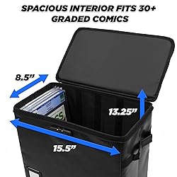 [LOCKING GRADED COMIC BOOK BIN]: Designed to securely store 30 graded comics. Hard shell rigid exterior and scratch resistant interior protection. Includes three removable dividers to separate comics. Case ships flat with fold lock assembly. [FIRE-RESISTANT DESIGN TO PROTECT YOUR GRADED COMIC BOOKS]: This comic box is made of double-layered non-itchy silicone coated fiberglass wrapped over PVC boards to withstand high temperatures during a fire. The material can also repel water. [PRECISION GRADED COMIC STORAGE]: Every aspect of this case has been designed to properly store your valuable comic slabs. The book bin interior dimensions are 15.5" x 13.25" x 8.5" to provide a perfect fit for a variety of collectible comic books. [INCLUDES THREE REMOVABLE PARTITIONS]: Internal comic book storage has three padded dividers that adhere to the non scratch walls. They can be removed or added as needed to create graded sections, prevent movement and keep your comics held upright [LOCKABLE, BUILT-IN CARRY HANDLES & HEAVY DUTY ZIPPERS]: The case is securely held shut with two durable zippers that can click into the code lock built directly into the side. Use for added comic case security during travel or everyday storage.