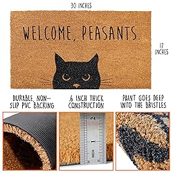 Practical year-round decor - Welcome Peasants cat doormat trademark pending will have your guests chuckling before they even step inside; Black cat door mat makes for great welcome mats outdoor funny Durability in every fiber - Tightly woven coco fibers .6 inch in height make our welcome mats outdoor funny durable black cat decor but also great cat rug black cat gifts Trademark pending designs for every doorstep - Check our storefront for a wide range of funny welcome mats to choose from, so you can find the perfect cat welcome mat for front door to match your personality; Features paint that doesn't bleed & goes right into fibers Steady and slip-free - Non-slip PVC backing ensures that your black cat outdoor mats for front door will stay in place; Cat doormat coir for halloween or any season Proudly designed in the USA - Our funny door mats outdoor are the purr-fect door mat cat to let your guests know who's really in charge of the house