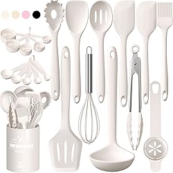 Food Grade Silicone Kitchen Utensils Set: Crafted from premium, food-grade silicone, Umite Chef 22-piece kitchen utensil set is entirely free from harmful substances and unpleasant odors. It ensures safe, healthy food preparation and will not react with your ingredients. The soft, flexible heads provide effective non-stick surface protection, safeguarding your cookware from scratches. DURABLE & COMFORTABLE HANDLE: These Umite Chef silicone utensils are reinforced to flip and scrape with confidence, yet remain soft and flexible to protect your cookware from scratches. They combine long-lasting durability that won't bend or break with the thoughtful addition of hanging holes for effortless, space-saving storage. Heat-resistant: The silicone head withstands extreme heat up to 446°F (230°C), ideal for high-temperature techniques like searing and deep-frying. Paired with silicone handle that stays cool to the touch, ensuring a secure and comfortable grip while protecting your hands. The Complete Kitchen Companion: This 22-piece set eliminates the need for repetitive purchases by providing all the essentials. It includes: 1 x Ladle, 1 x Pasta Fork, 1 x Spoonula, 1 x Slotted Spoon, 1 x Kitchen Tongs, 1 x Slotted Turner, 1 x Whisk, 1 x Brush, 1 x Large Spatula, 1 x Small Spatula, 1 x Egg Separator, 1 x Stand, 5 x Measuring Spoons, and 5 x Measuring Cups — ready to handle everyday meals and creative recipes. Effortless Cleaning in Two Steps: Crafted from high-quality, non-porous silicone, this set cleans up in seconds. A quick wipe under running hot water or a gentle rinse in warm water is all it takes to lift away oil and residue. For optimal care and longevity, hand washing is recommended.