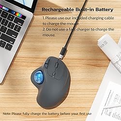 Ergonomic Design with Smooth Thumb Control: Move your cursor by the smooth trackball instead of moving your wrist and arm. Let the easy and smooth thumb control help you reduce your muscle stress. The optimal angle of the trackball mouse allows you to keep your palm in a natural position for all-day comfort. Precise Tracking with Adjustable DPI: Nulea trackball mouse provides precise cursor movement for exceptional accuracy and control. With the smooth trackball, you can be more productive on the move on almost any surface, any workplace. Especially on the narrow space, such as the messy desktop, couch, bed, small writing board on a chair, etc. True Wireless Freedom: Connect up to 3 devices by either bluetooth or USB dongle. Switch easily between them by the button on the bottom to improve your efficiency.(KINDLY REMINDER: The 2.4G USB receiver is stored at the bottom of the mouse). Rechargeable Battery: (For your best experience, please fully charge the mouse before your first use) The built-in rechargeable battery has a long battery life enables you to say goodbye to dry cell batteries. Please Note: 1. Please use our included charging cable to charge the mouse 2. Do not use a fast charger to charge the mouse. (Directly use the computer USB port or a 5V charger to charge the mouse). 6 Button High Performance: Nulea trackball mouse bluetooth is designed with thoughtful ergonomic details and an elegant curved shape. Plus the back and forward button, you can operate easily with higher productivity as well as added comfort. Note: all the buttons are non-programmable.