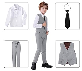 Toddler Suit for Boys-This boys suit is made of a skin friendly material with good comfort, a soft feel, and a lightweight texture. We soften the touch of toddler suit, making your child very comfortable 4 Pieces Boys Suits-Boys suit set included vest, shirt, flat pants, tie or bow tie. Simple and generous collocation not only makes boys elegant and mature, but also keeps them childlike Boys' Formal Suit Set with Unique Design-This boys dress outfit features high-quality buttons and a slimming design. A clean white shirt paired with a tie or tie is more concise and elegant, while comfortable flat bottomed pants are even more perfect. They have a hidden sense of luxury, creating a classic and timeless set Occasion-Slim fit boys formal tuxdeo suits for weddings, Easter, homecoming, parties, piano performances, awards ceremonies, Eucharist, homecoming, Easter, churches, performances, holidays, thanksgiving, christmas Slim Fit Boys' Set Sizes We have multiple age group sizes for small boys' sets. Please refer to our picture size chart. If you have any questions, you can tell us and we will help you solve them at first time