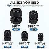 TICONN 52 Pcs IP68 Waterproof Cable Gland Kit Nylon NPT Adjustable Cable Connectors Assortment 1/4” 3/8” 1/2” 3/4” 1“ for Waterproof Junction Box Wire Pannel (Black, 52 Pcs)
